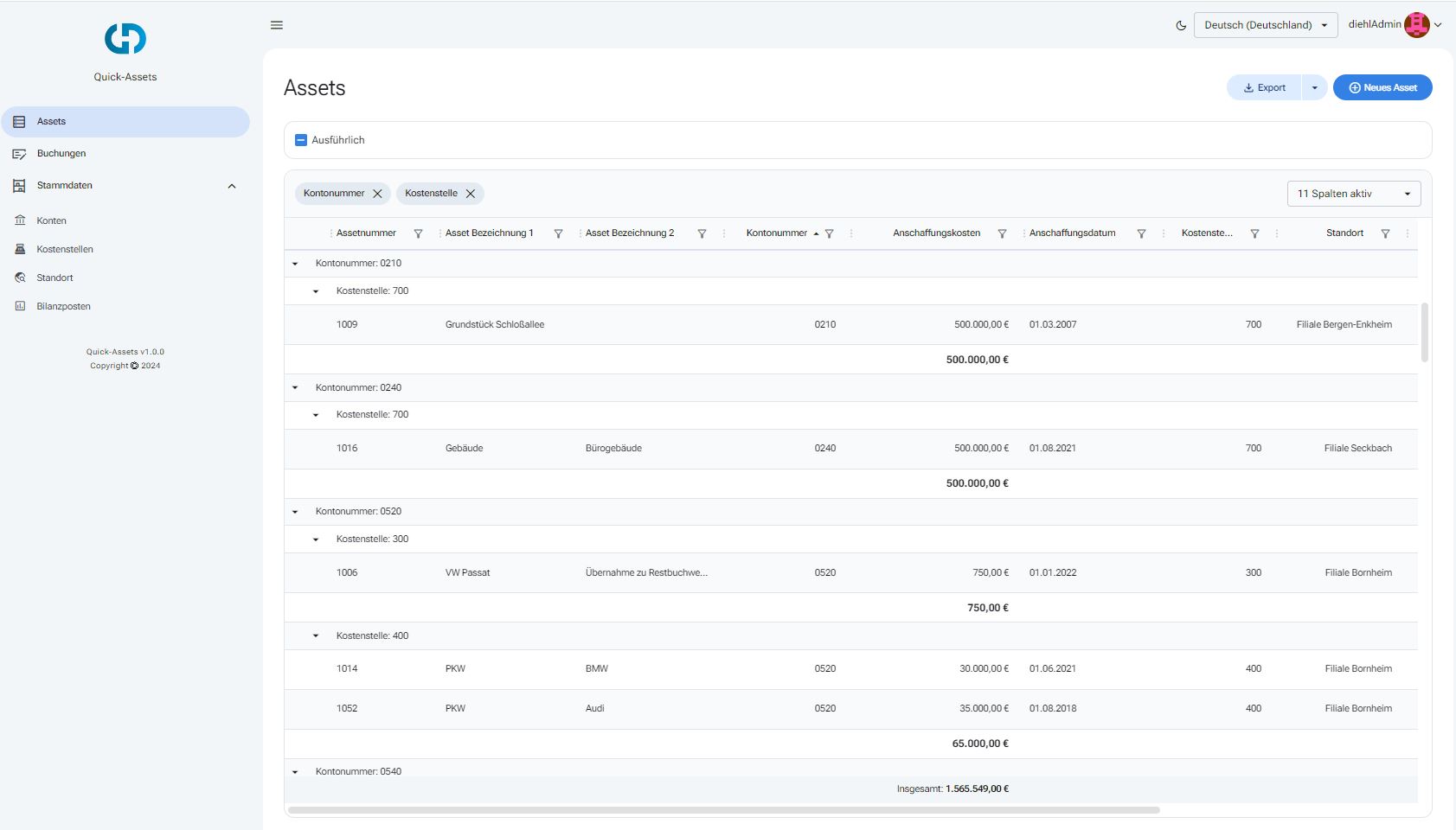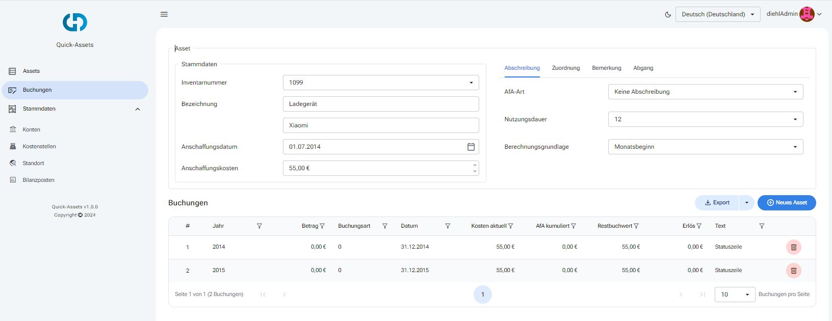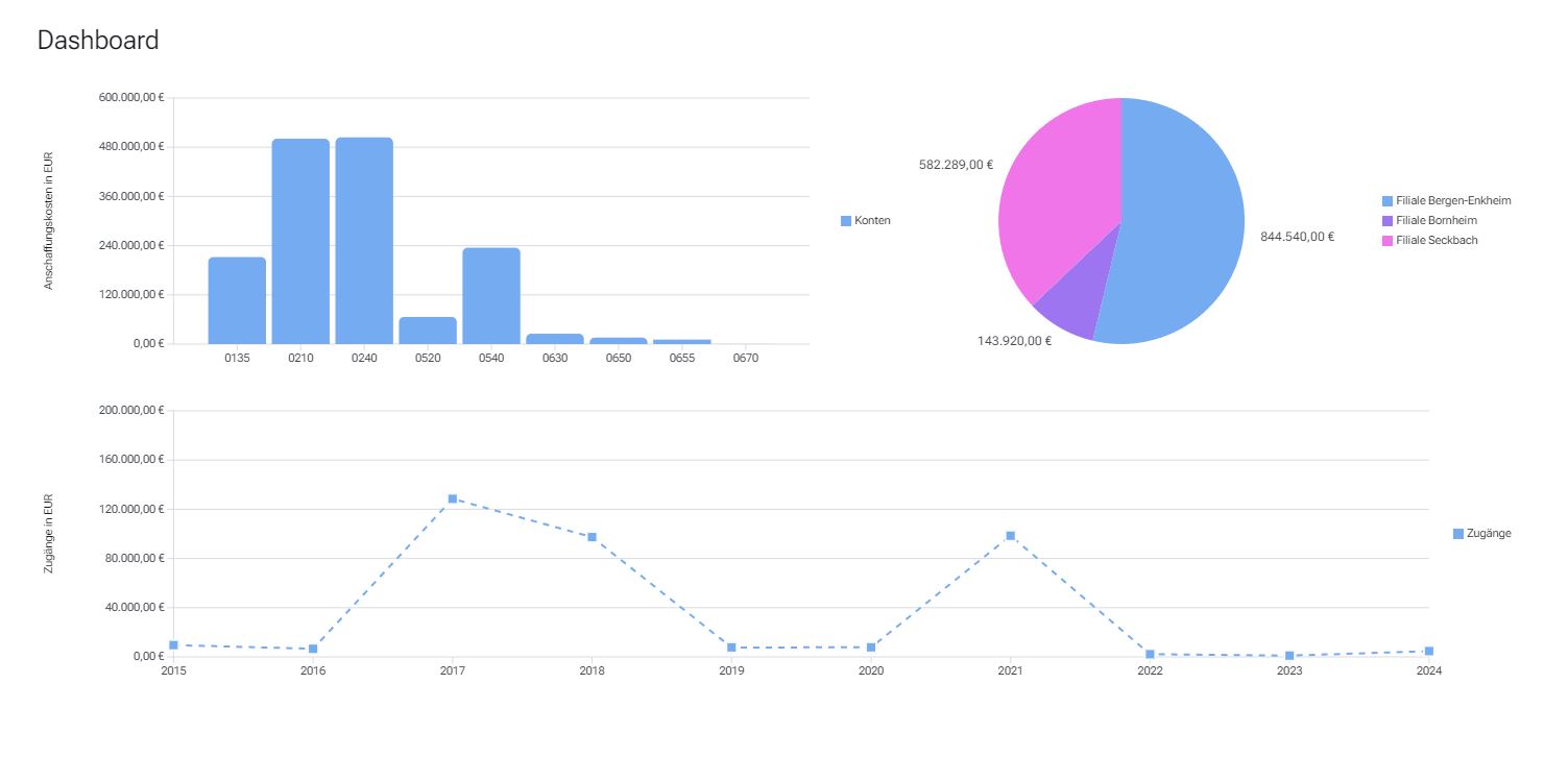 Das Dashboard von Quick-Assets bietet eine klar strukturierte und leicht verständliche Benutzeroberfläche, die alle wichtigen Finanz- und Inventurdaten auf einen Blick präsentiert. Ohne großen Einarbeitungsaufwand können Sie sofort loslegen und Ihre Buchhaltung effizient überwachen. Ob es sich um Zugänge, Abgänge, Buchwerte oder Abschreibungen handelt – alle relevanten Informationen sind übersichtlich zusammengefasst. Die flexible Anpassungsfähigkeit des Dashboards macht es für Unternehmen jeder Größe geeignet und stellt sicher, dass Sie Ihre Buchhaltung immer im Griff haben, egal wie komplex sie wird.